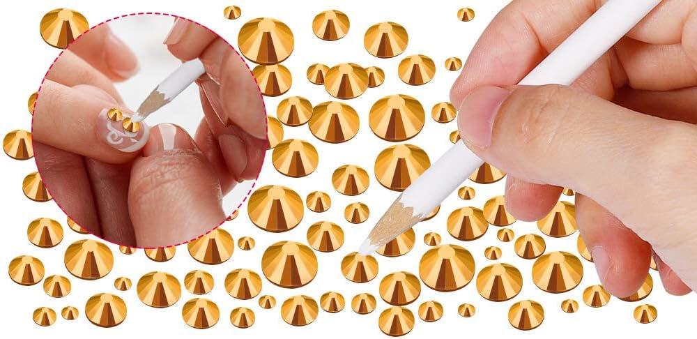 【HELPFUL PICK-UP WAX PENS】The nail art rhinestones set also include 2 sticky pencils that are very helpful in picking up the little jewels, just make sure you arrange the jewelry face up first before you start working on them