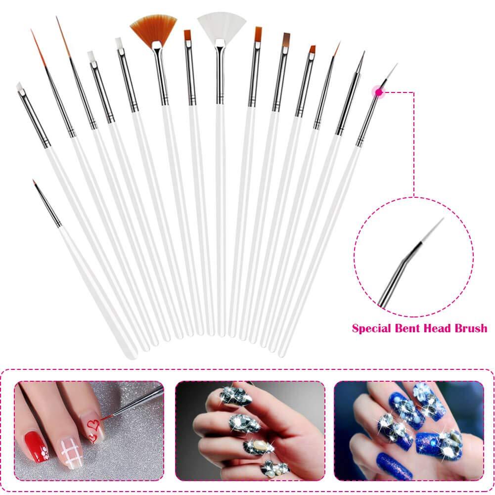 【NAIL ART BRUSHES】 15pcs nail art brushes: 2 flat fan brushes; 1 angled head brush; 1 pattern brush; 2 liner brushes; 3 flat brushes; 3 oblique brushes; 1 dotting pen brush; 1 drawing brush; 1 petal brush. Covers all the range of brushes you'll need. Double-ended nail dotting pen is end with a large ball and a small ball for various size dotting
