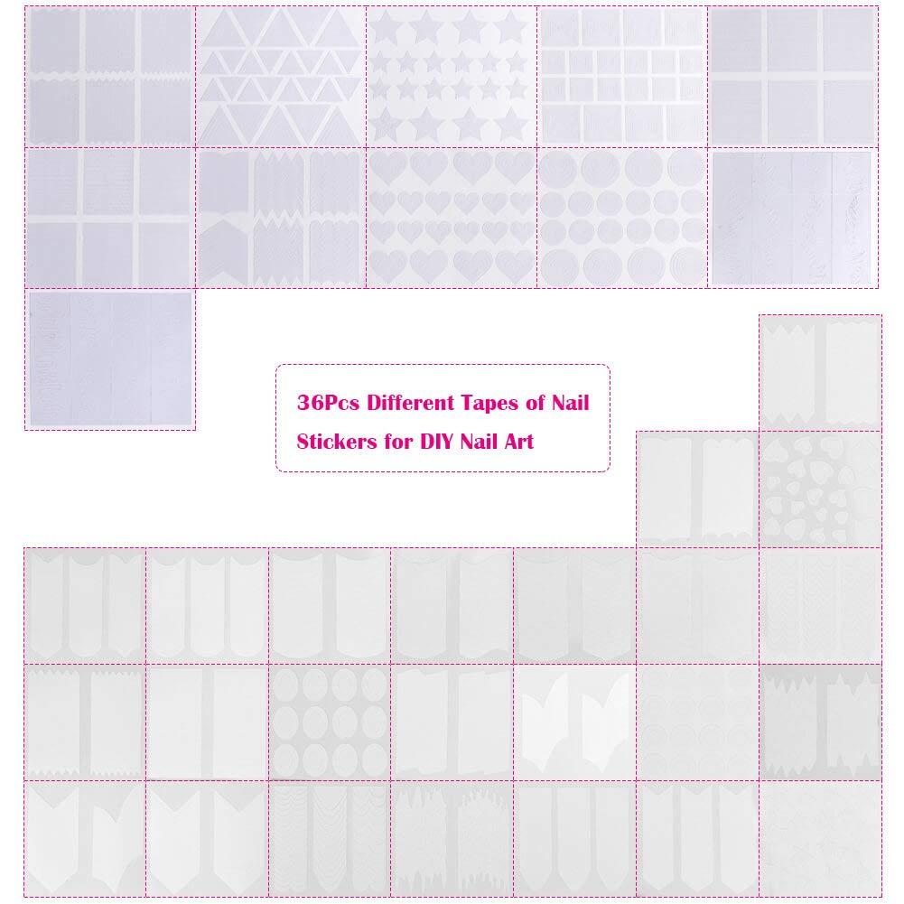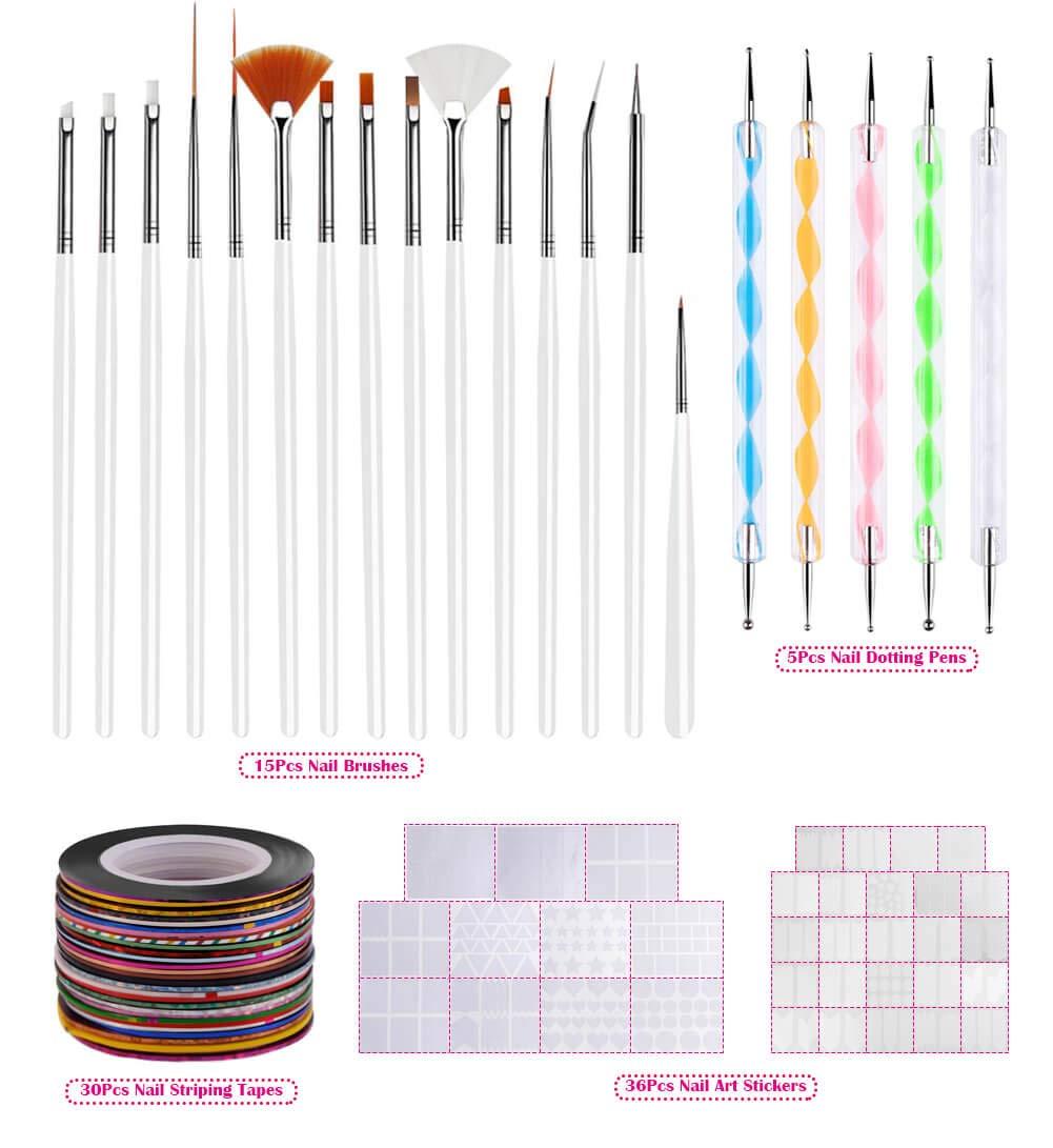 【WHAT YOU GET】Anezus nail art design kit including 15pcs white handle brushes, 5pcs nail dotting pen, 30 assorted colors nail art striping tape and 36 sheets (1275 pieces) 49 designs nail art stencils french tip guides stickers. This nail art tools set includes all the basic nail art equipment to create wonderful nail art designs